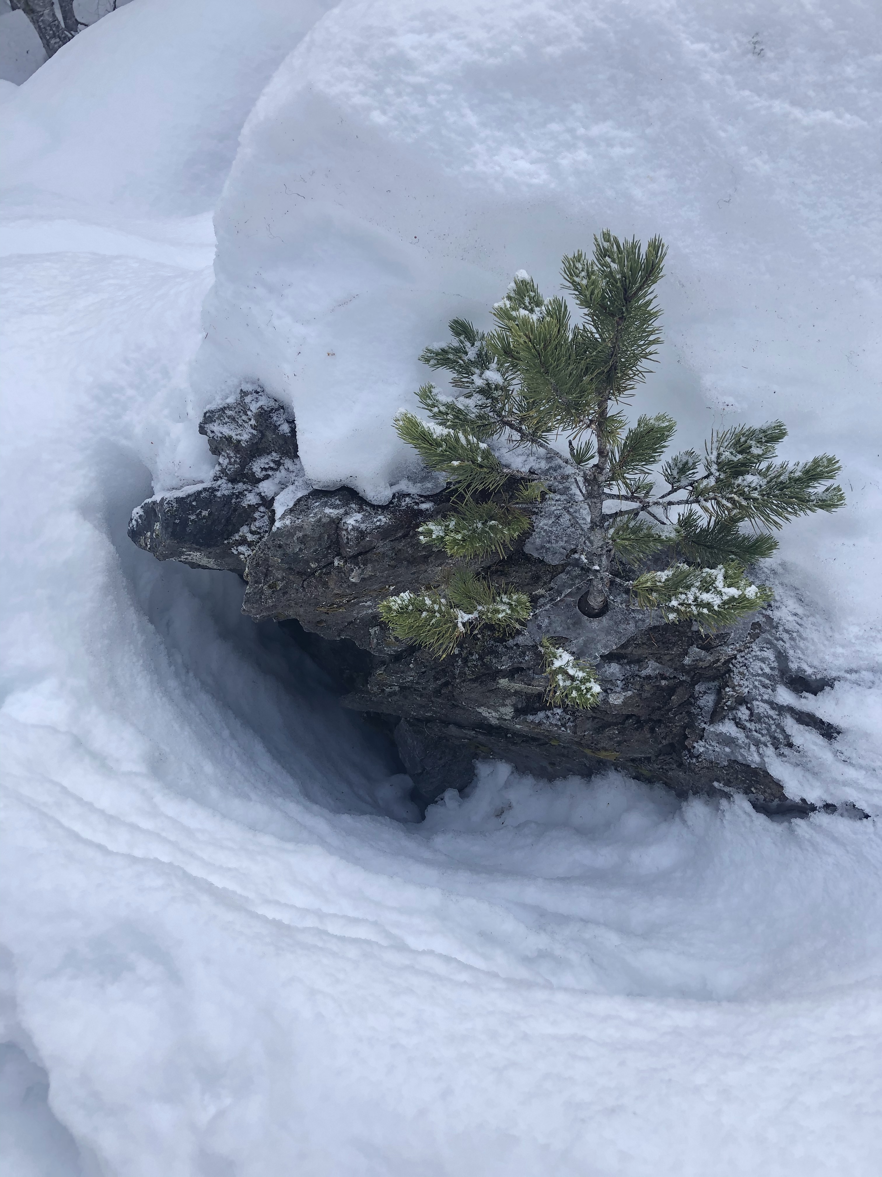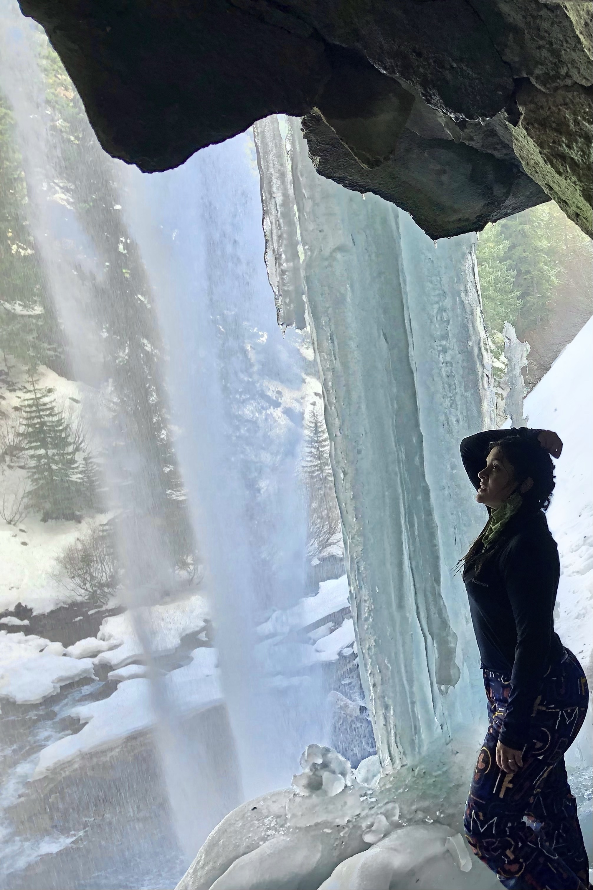 - With Ice/Snow: You could probably go the same route… but I don’t. I stay low, go underneath the fallen tree, and climb up when I get closer to the waterfall. This route is a little more crampon friendly and gives a gradual rise and I don’t get as wet. Plus, the wind blows the falls up towards the edge so most of the area near the top is under a thick layer of ice. Stay away from the river edge because the snow is thicker than you think and you can’t guarantee it won’t fall out from underneath you since snow can hide the spot where the ground ends, you know?