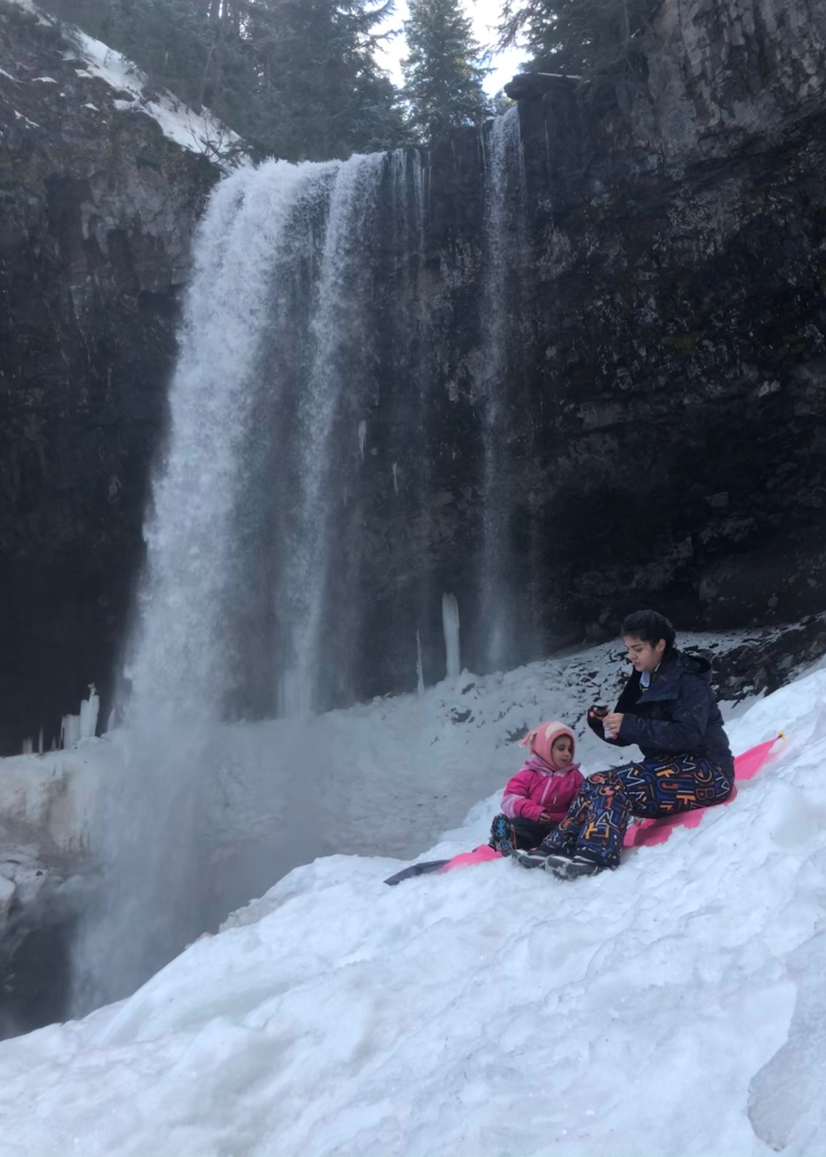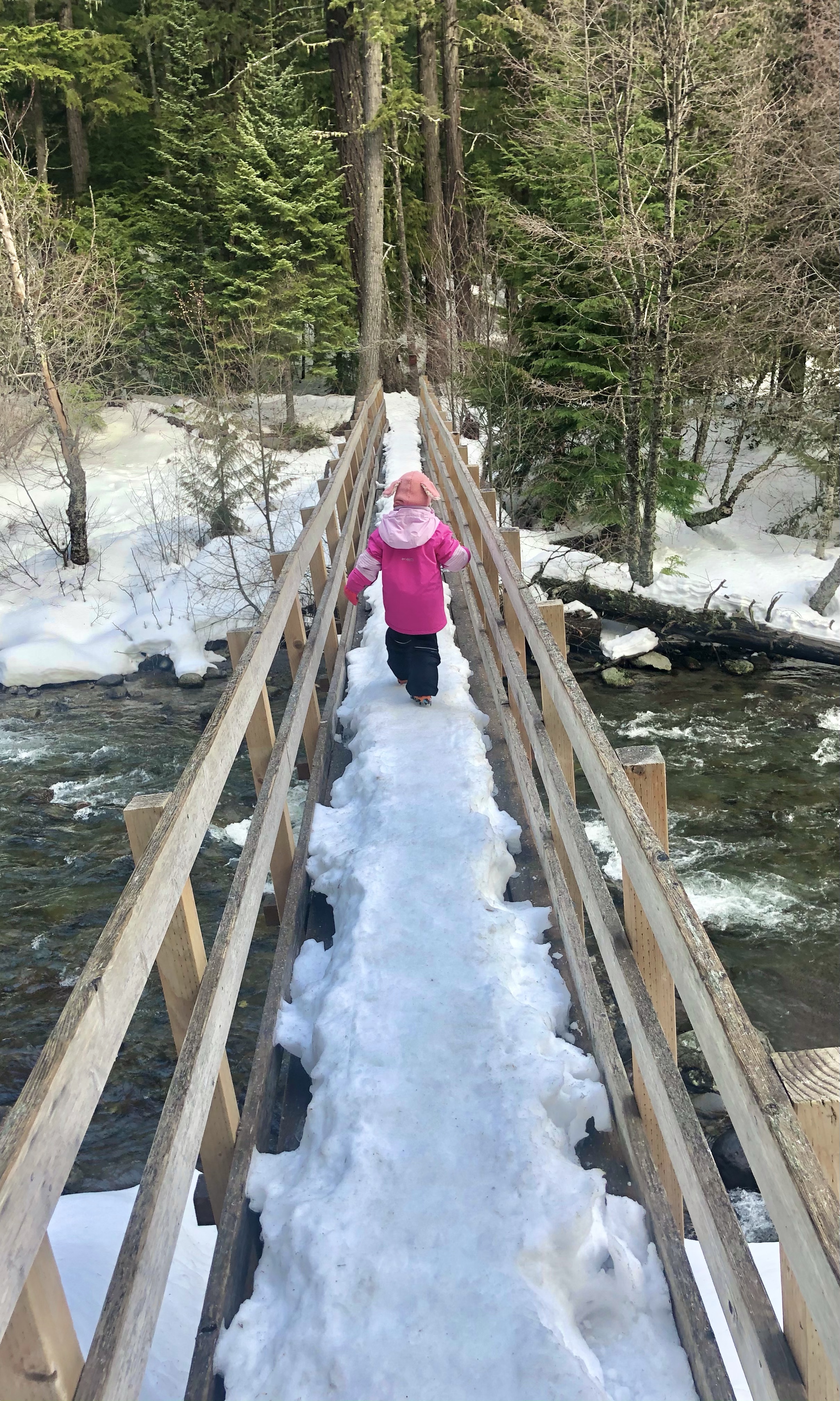 The trek starts out on a bridge over a gorgeous river then proceeds to the right twisting and turning and then turns into an incline until you reach the top. If you start seeing the highway you were just driving in, you know you’re close to the top! It’s almost a 2 person wide trail, but there’s also a drop on the edge. I always tell my kid to stick to the mountain side. We almost lost a yorkie here because a 4 year old was leading the dog and turned the corner to quick and thank heaven it had a harness because the thing went over the edge but we were able to pull it back in…. anyways, then it starts to go back downhill for awhile until you reach the next bridge. This spot is horrible for traction without crampons when the path is icy, but people do it… on their butts.