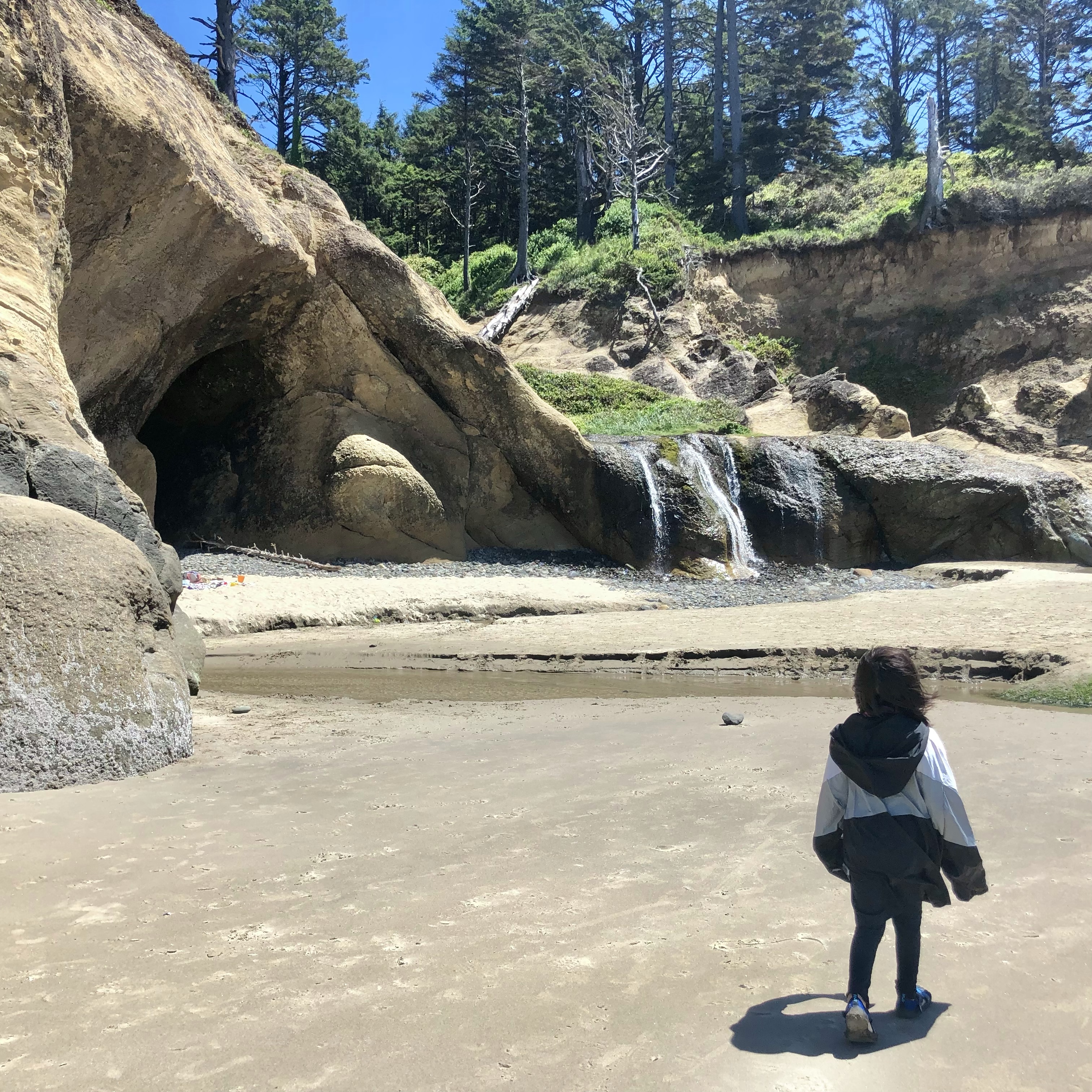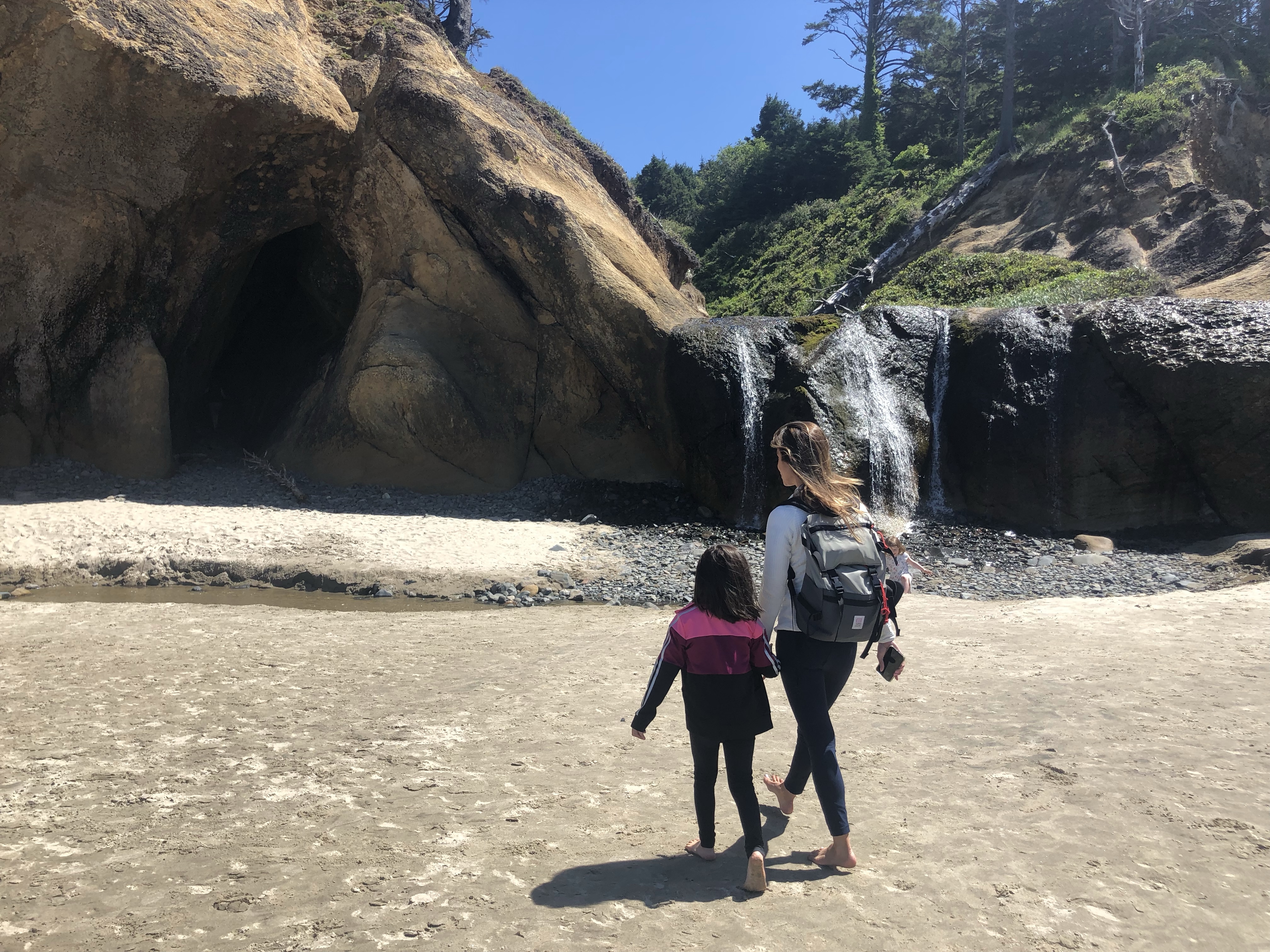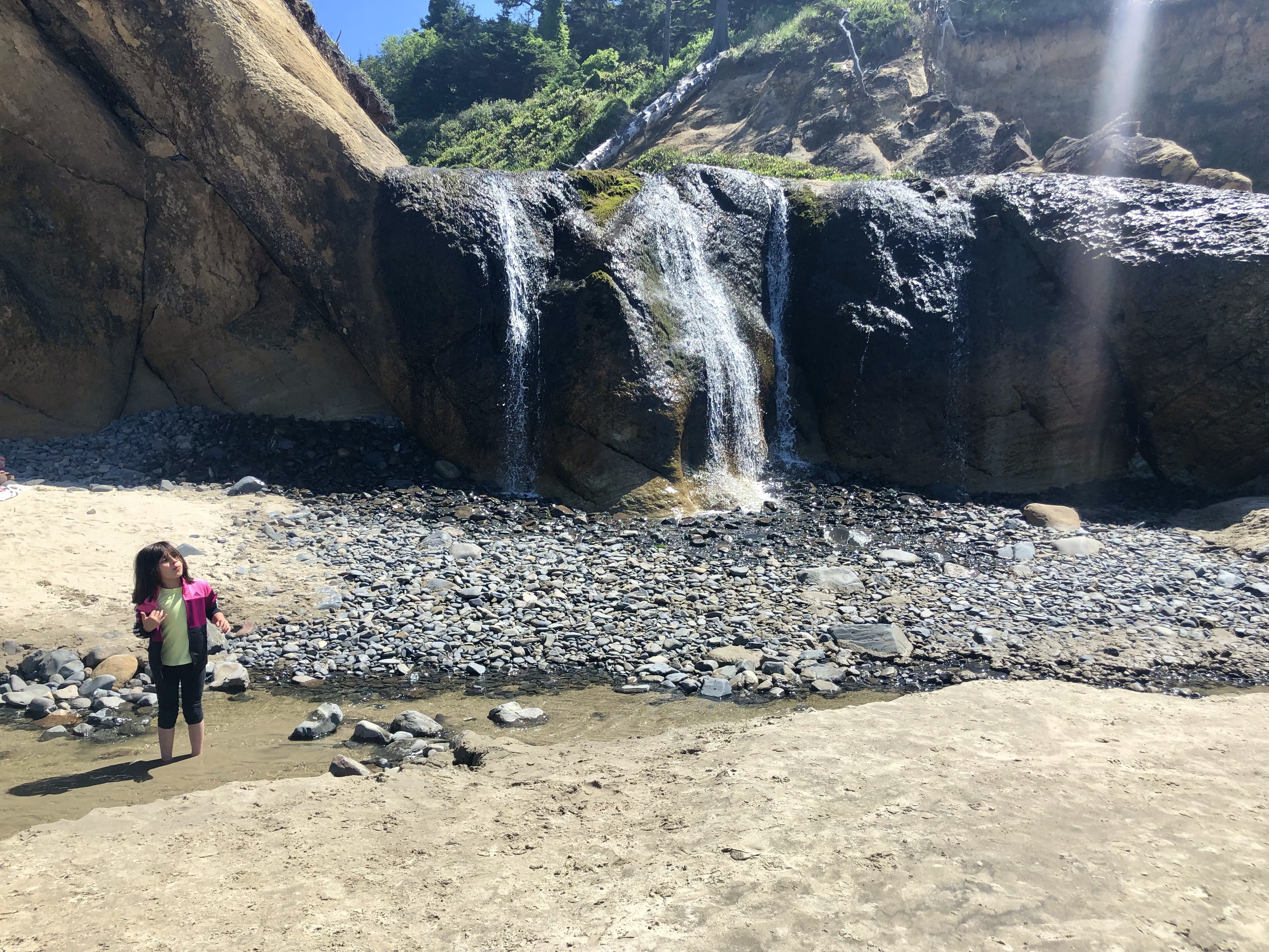There are more caves, tide pools, a waterfall and freshwater creek to play in, a forestry area above the waterfall you can explore (hello mini hike!), and tons of sand to play in. You can walk for miles if you want, just BE VERY MINDFUL OF THE TIDE SCHEDULE because you could get trapped and then you’d either have to venture through the trees towards the main road or wait until it goes back out again… assuming you aren’t in a spot the tide would reach.