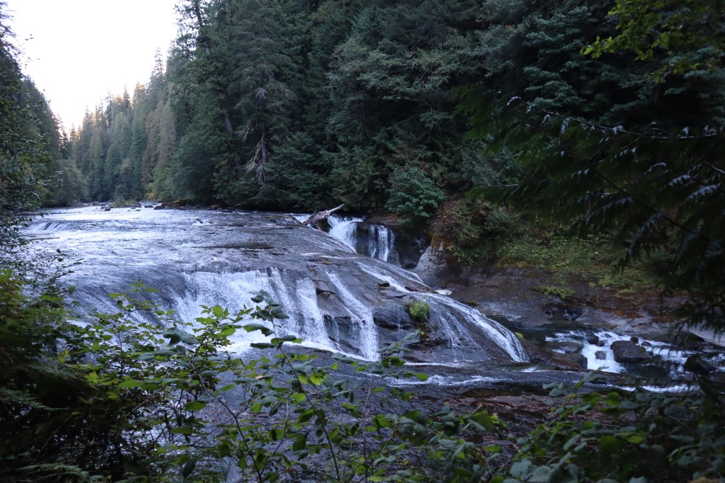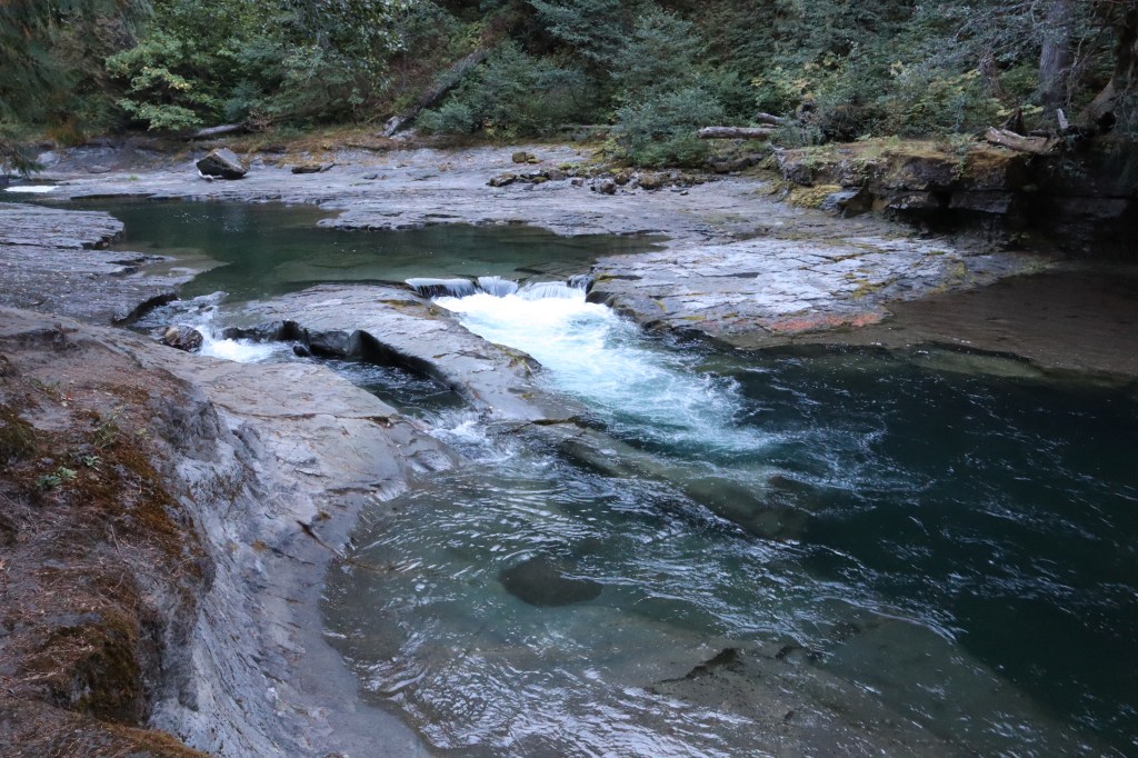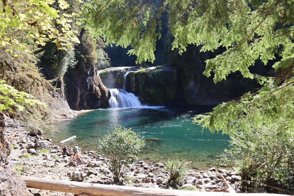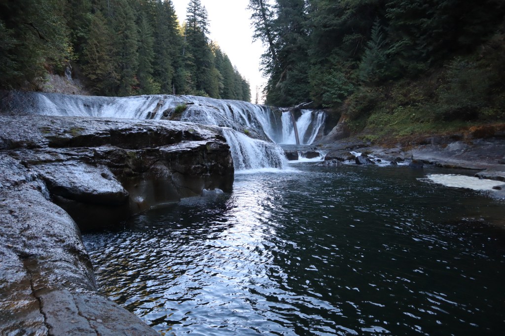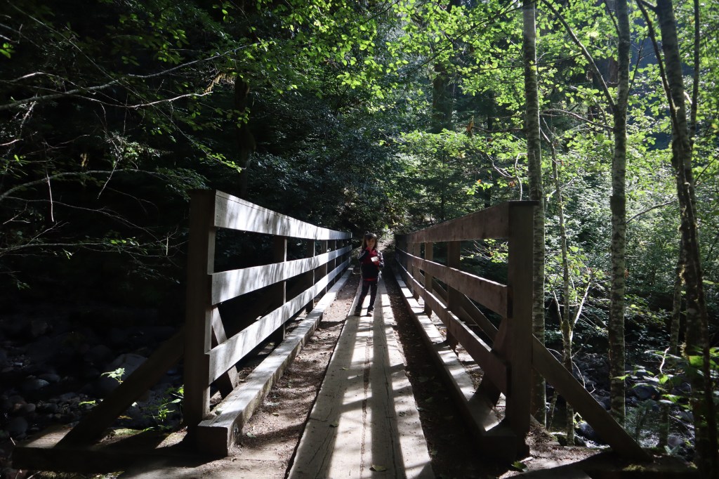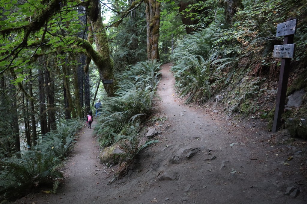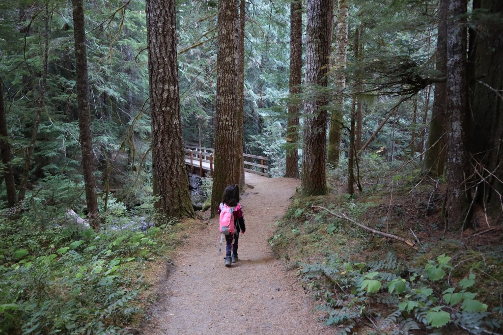 The Trailhead/Parking: is great! No toilet at the Middle Falls parking, but I’m pretty sure Lower Falls Day Use parking has a toilet (it’s a campground – so it should be a nice one), and we didn’t see Upper Falls Parking. Our parking lot was a giant gravel lot with a decent information board.