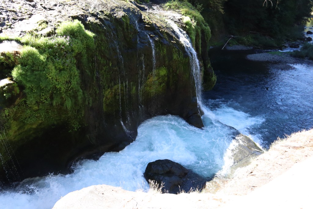 The waterfall was breath taking. Water tumbled over rocks in a deep turquoise blue and cascaded down the embankment with an elegant force. The water was so clear, in shallower spots you could see the clay colored banks that jutted out on either side clearly and make out the current that swiftly ran underneath them into a deeper darker blue that turned to shadow. The thought of sliding down the waterfall and getting caught in that current and getting pulled under the rocks that jutted out gave me a shudder. But it beckoned at me and I wondered if swimming was allowed on a hot day.