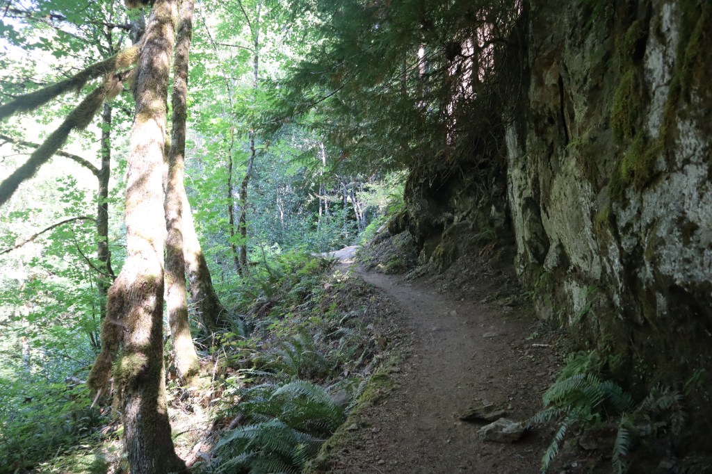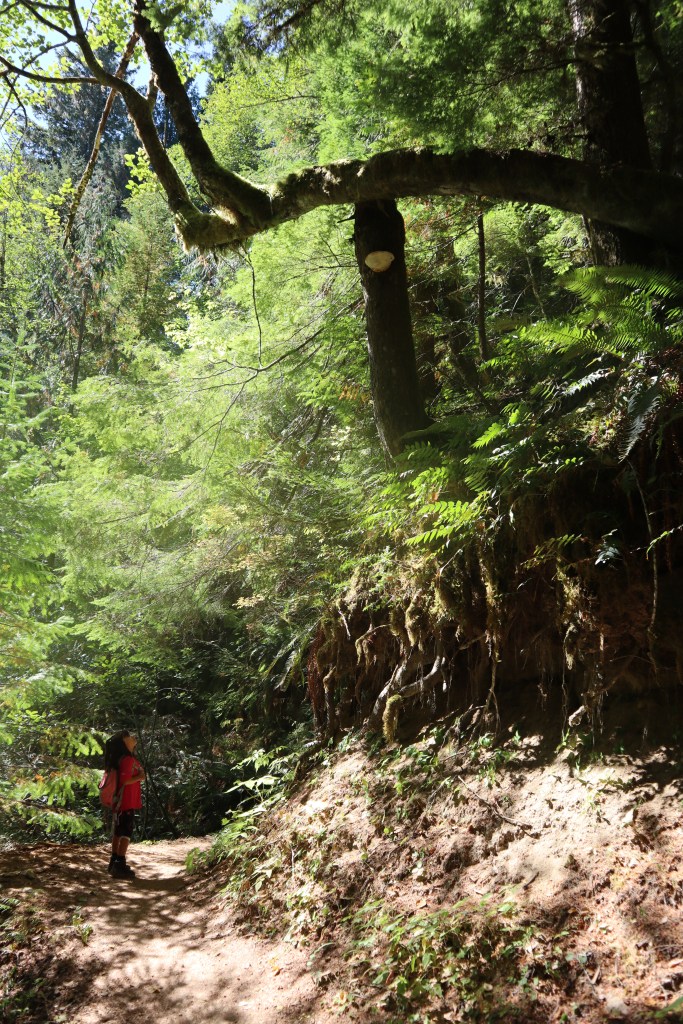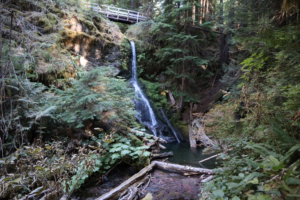 We set off to the left (north) trail on the far end of the parking lot following the signs. The trail went along the road for a bit and felt a little disorienting because it kept winding along in a direction that did not feel North. After a little while on a smooth, wide trail, we crossed a bridge over a creek. Every waterfall excites me, so the sound of rushing water and the chance that a cute little waterfall was below us made me rush down the trail to see. We were wrong, it wasn’t a small waterfall, it was in fact a tall waterfall and it was so pretty! I stood there and took far too many photos of it. I had only received my camera recently, so I wasn’t used to the configurations and every shot I attempted came out over exposed or too dark or blurry. I soon gave up in response to my daughter’s nagging and my father’s obvious sighs of disapproval. I figured I could try again later on the way out or revisit another time.