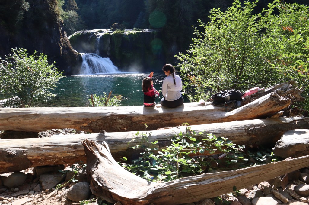 Eventually we reached the River and I realized we’d been following a creek the entire time. We could see the waterfall! It looked gorgeous! I had assumed the waterfall was much closer to where we parked, but once we reached it, it felt like it was farther than my watch was reading as our mileage. We continued down the trail all the way to wear it splits to the viewing point. Jade let out her first whine of the trip, “I’m huuuuunnngggrrrry mom and I just can’t keep going without a snack.” She quickly scarfed down an apple sauce pouch and bag of goldfish.